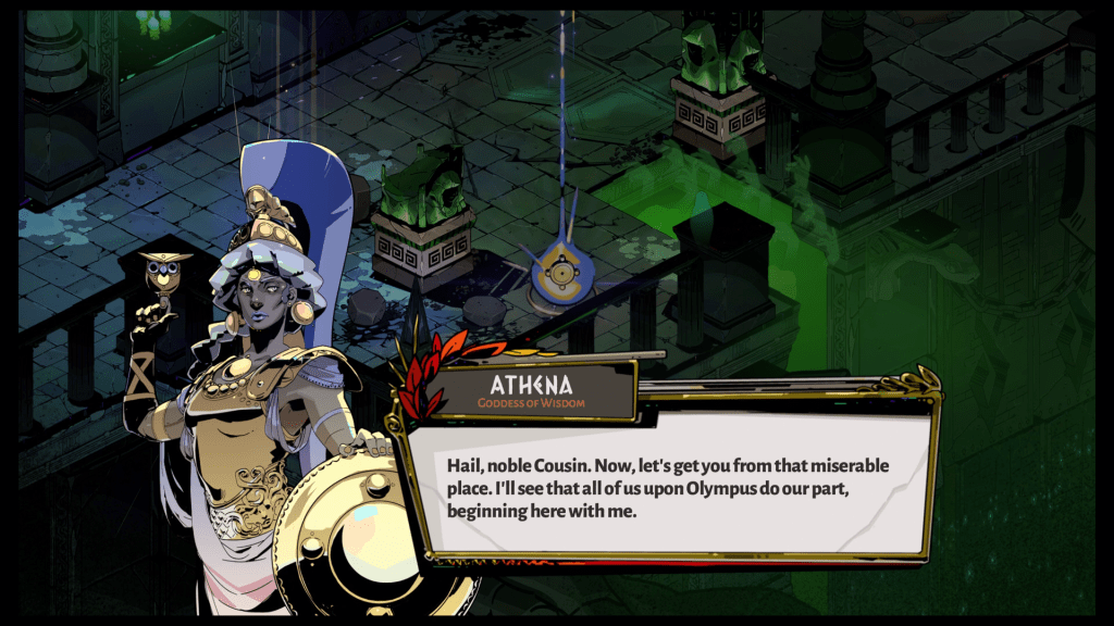 Before I go, I have to mention one more thing. Well, two more things actually. The art direction and music are fantastic in Hades. Everything from the characters to the environments are eye-catching and beautiful. As for the soundtrack, it was a pleasure to listen to through and through. At one point, I had to stop in my tracks and simply listen because of the song that was playing. I won’t say which song it is because it would spoil a great moment in the game. Just know that it was quite good.