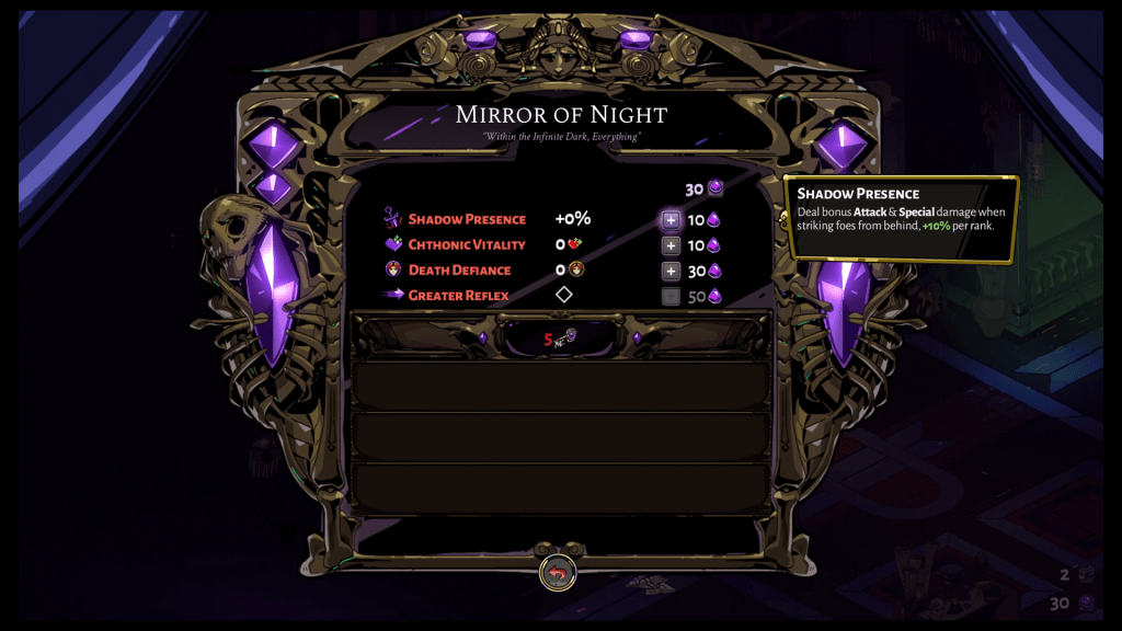 And that about does it as far as the game goes…is what I would say if that was the truth. If I had to describe Hades with one word that word would be onion. That’s because there is so much more to the game than what you see on the surface. Everything I’ve talked about so far merely provides a base for the game to build upon. There are many more layers stacked upon all of the systems which make up this game. Let me go through a few examples but I won’t go over everything because it’s much better to discover it for oneself.