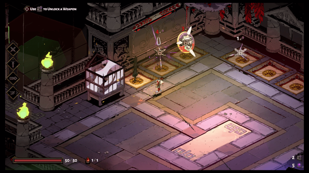 To do so, he must choose one of six weapons for this endeavor. There is only one weapon available to start with so don’t get too excited. The rest of the weapons are unlocked using a currency Zagreus gains through his many, many escape attempts. They’re called Chthonic keys but no one would know what I was talking about so I decided to call them currency. See, now I’ve gone and wasted a bunch of time for something as simple as what you use to unlock new weapons. You’re welcome. Anyways, back to Hades!