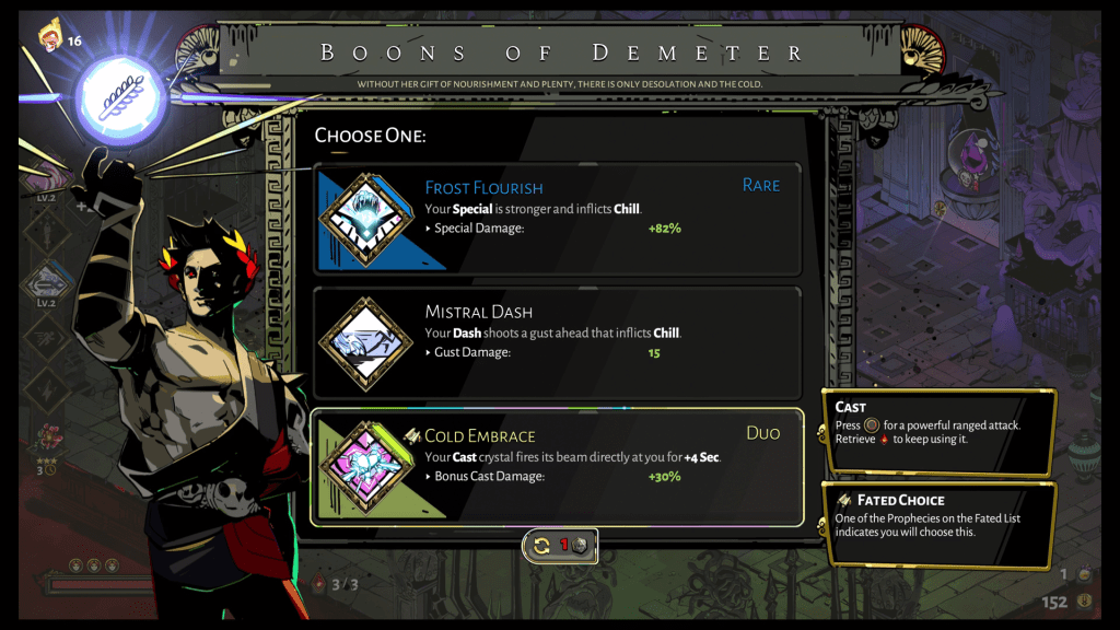 Do not worry, dear readers, Zagreus does not have to face his enemies by himself. The gods of Olympus will join the fray and by join I mean they will confer what are called boons upon Zagreus. These boons grant a variety of benefits ranging from extra damage to new attacks for Zagreus to use. It was a lot of fun discovering new boons to use as well as mix and matching them with boons from multiple gods.