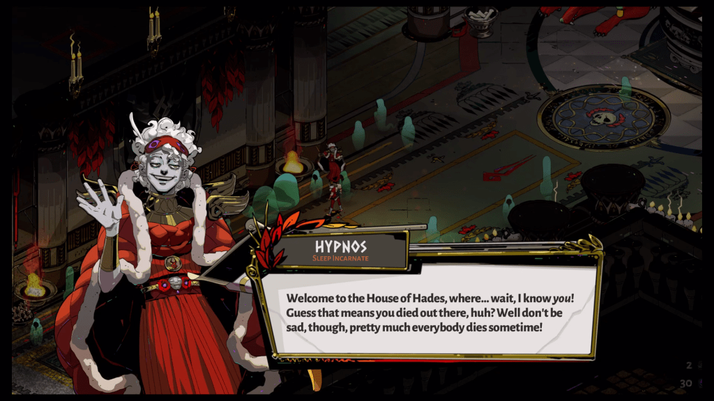 You will not only be talking to characters while out on runs either. Once you die, and die you will, Zagreus will return to Hades’ palace at the bottom of the Underworld. Here he can talk to the residents of said palace and glean more information about why he wants to leave in the first place. I loved returning to this home base even if my death had occurred at the end of a long run because I got to talk to more characters. It was an inventive way to take the sting out of dying.